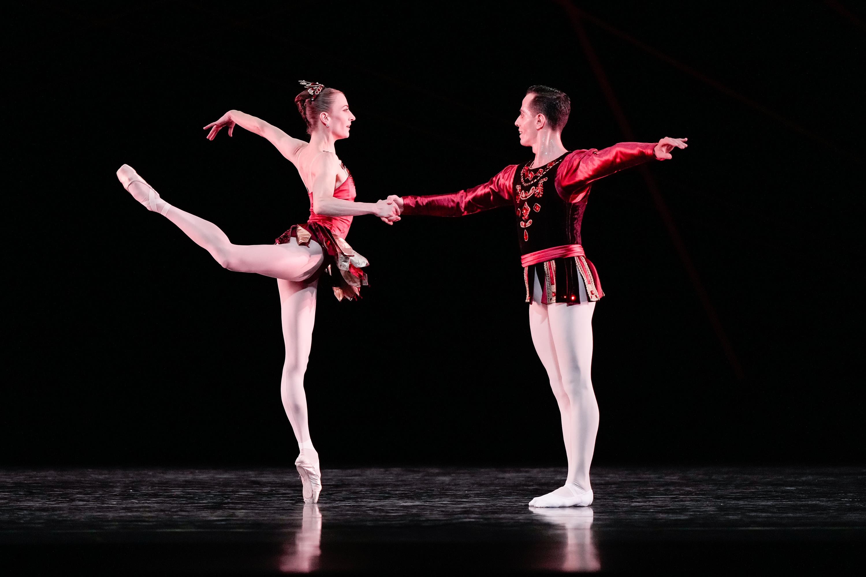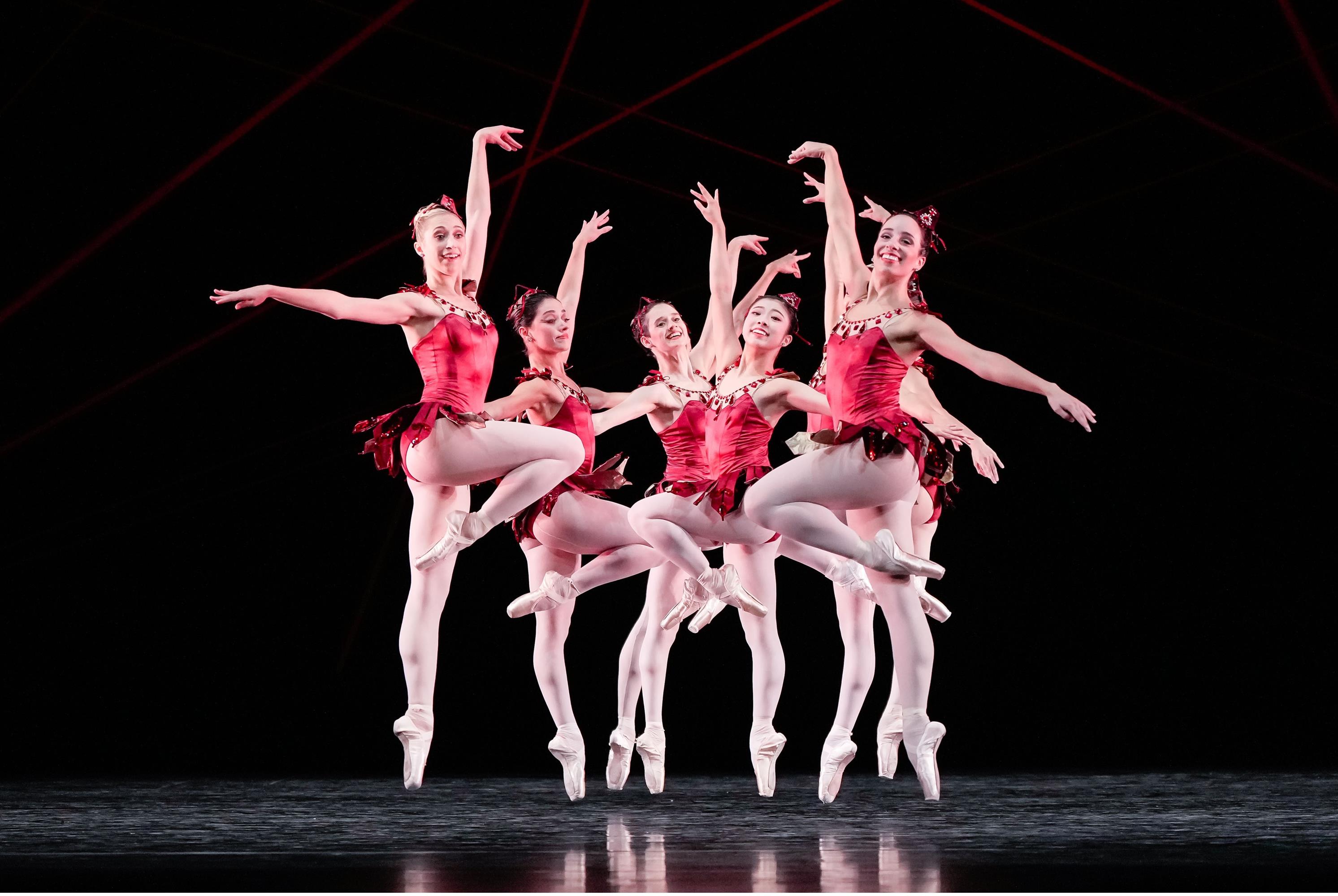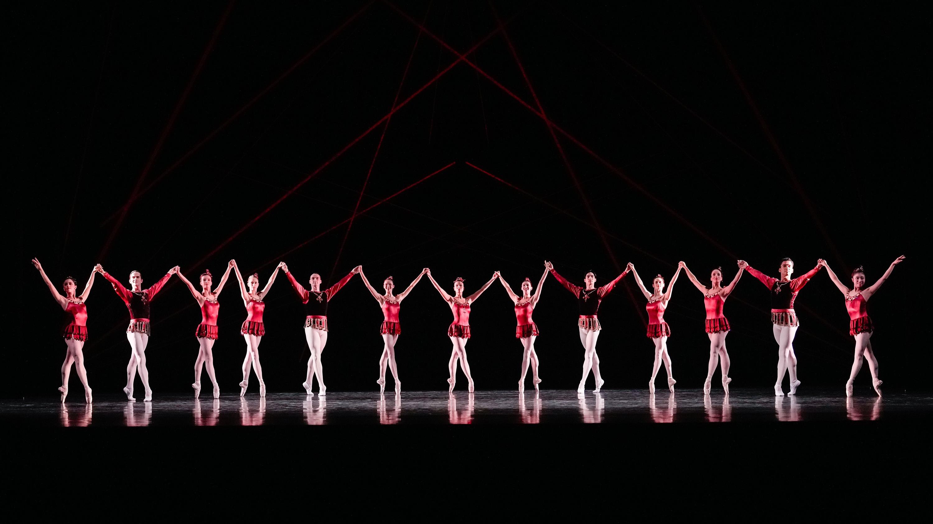 Den Auftakt des neuen Ballettprogramms macht mit George Balanchines „Rubies“ ein echtes Ballettjuwel, das mit scharfkantiger Präzision und scheinbar großer Leichtigkeit beeindruckt. Voller Energie wirbeln die Tanzenden zu Strawinskys „Capriccio für Klavier und Orchester“ über die Bühne und entfachen ein Feuerwerk aus komplexen Sprüngen, Spitzentanz und Schritten des Jazzdance.