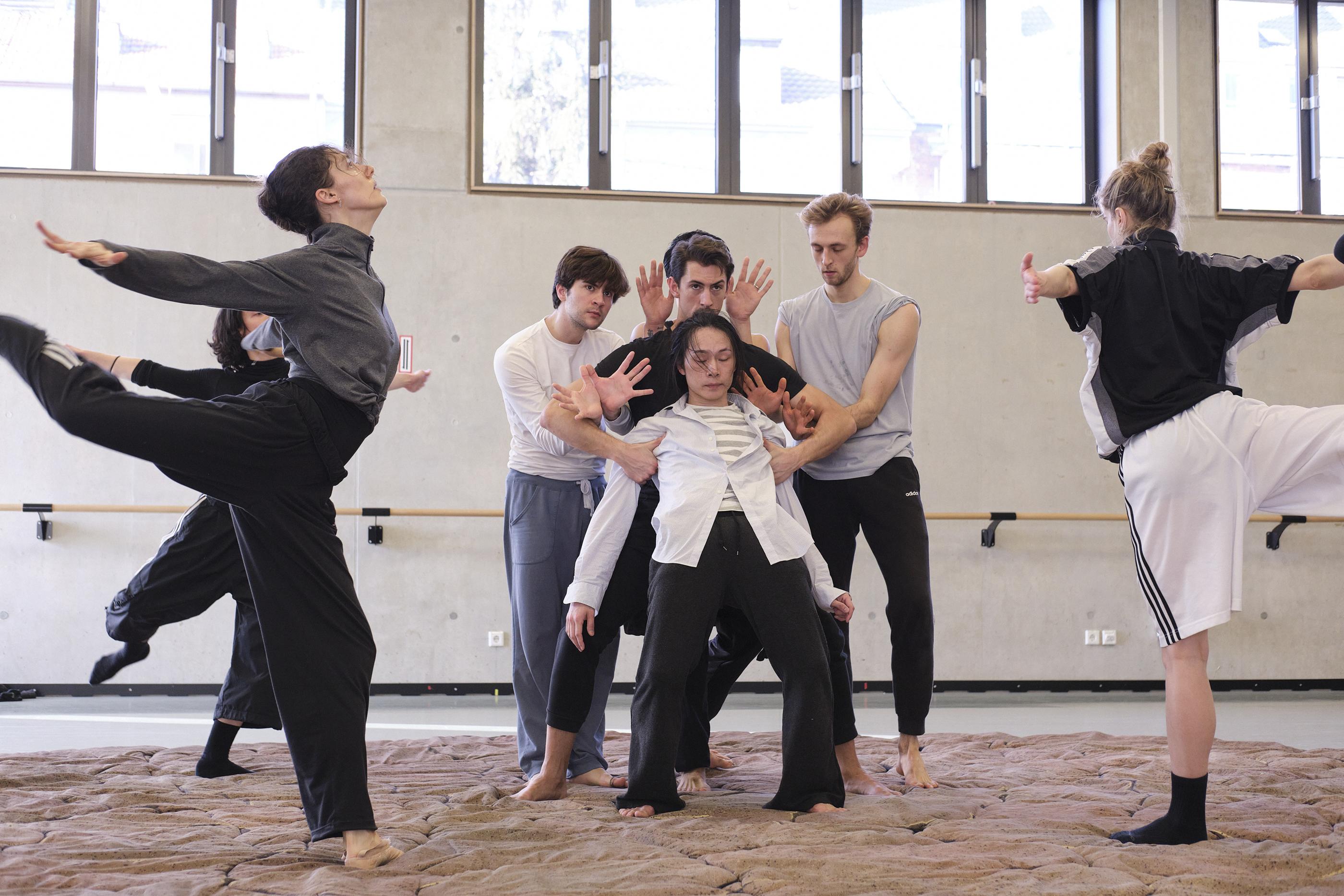 Endlich eine Pause. Die Tänzerinnen und Tänzer werfen sich schweratmend auf den Boden. Es wird berichtet, dass bei den ersten Proben mit Mthuthuzeli November der Wasserspender in der Balletthausküche leer getrunken worden ist.