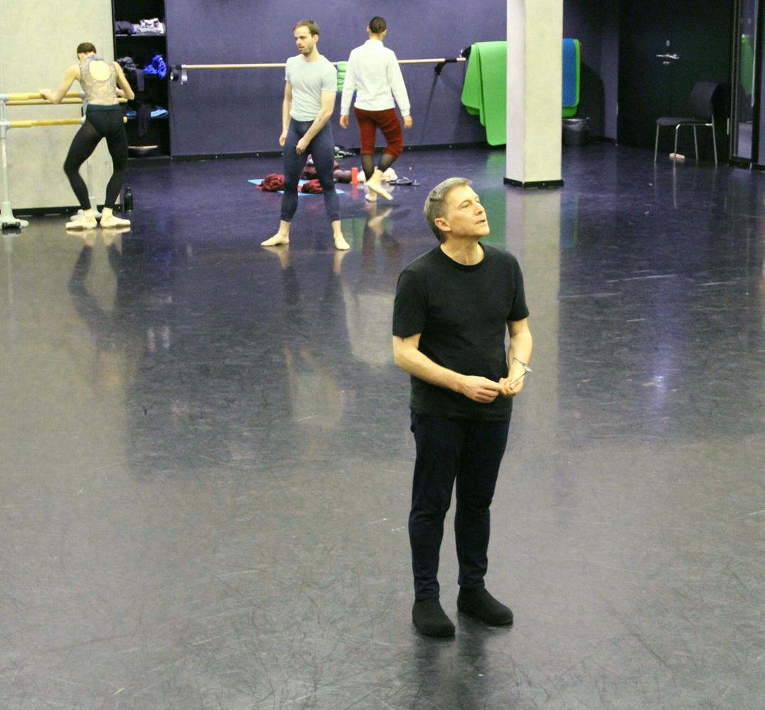 Martin Schläpfer choreographiert mit vollem Körpereinsatz. Er tanzt Abläufe vor, begibt sich in die gerade mit ihrem Partner eng verschlungene Position der Tänzerin, um zu testen, wie sich der nächste Schritt entwickeln könnte, übernimmt kurz den Part des Tänzers, um dann wieder die weibliche Position einzunehmen. Er nimmt Anregungen der Tänzer auf, prüft sie auf Validität, ändert sie, entwickelt sie weiter. Er lässt längere Bewegungsabläufe vortanzen, bespricht sich mit seiner Ballettmeisterin Julie Thierault, korrigiert und prüft erneut, ob die Abläufe für ihn stimmig sind.