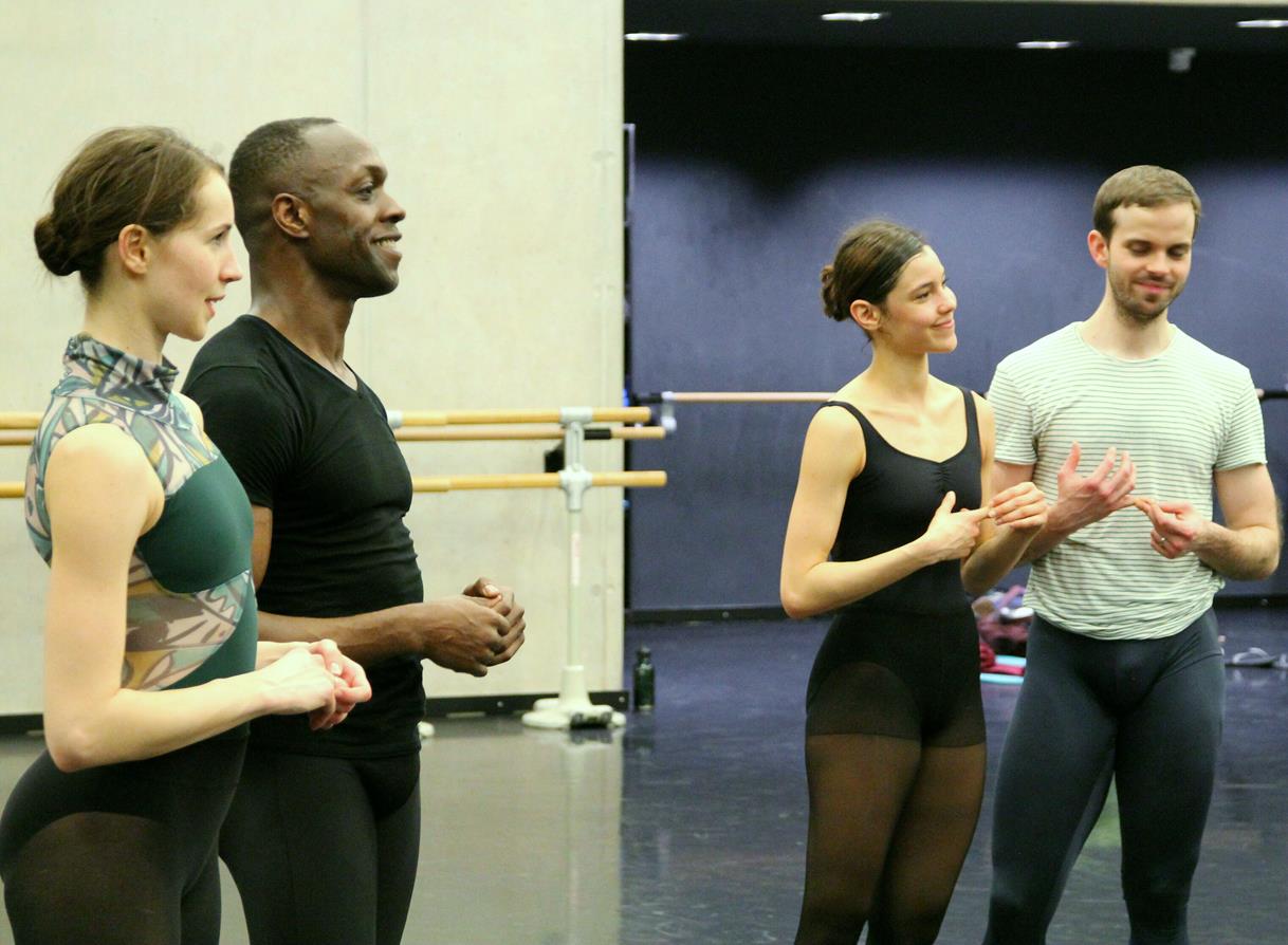 „Stell dir vor, du wärst hier ganz alleine“, sagt Martin Schläpfer zu Beginn der Probe der jungen Tänzerin Sinthia Liz. Das ist sicherlich nicht einfach, denn auf der Tribüne des Studios 1 sitzen etwa 100 Zuschauer und schauen gebannt auf Sinthia, die Martin Schläpfers Anweisungen tänzerisch umsetzen soll. Das gelingt aber so hervorragend, dass man schon bald das Gefühl hat, die vier probenden Mitglieder der Compagnie – Alexandra Inculet, Sinthia Liz, Michael Foster und Chidozie Nzerem – haben das Publikum ausgeblendet und konzentrieren sich völlig auf den Choreographen.
