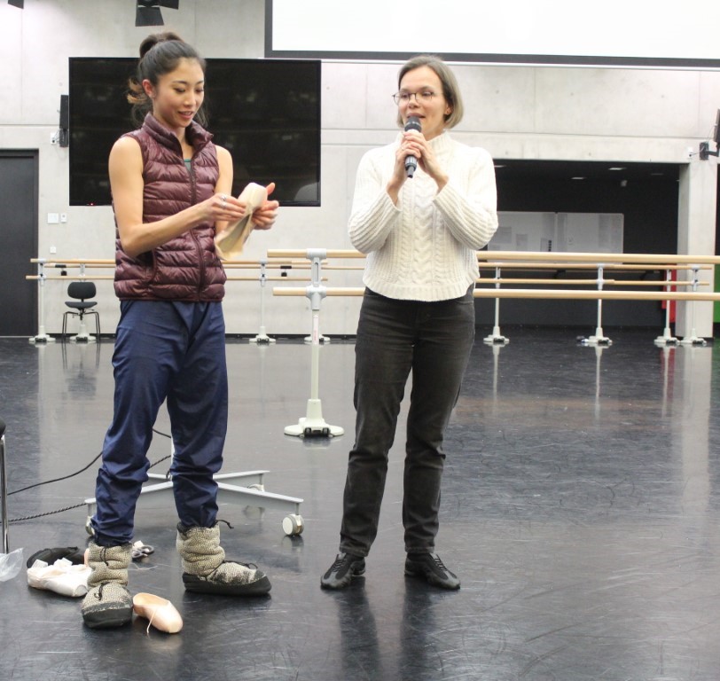 Eva reicht Spitzenschuhe herum, damit die Ballettfreunde sich mit dem Material ausgiebig „befassen“ können. Auf der Unterseite sind die Namen der Tänzerinnen eingeprägt, die die Schuhe für sich geformt haben. Da liest man „Dias“ und „Kato“.