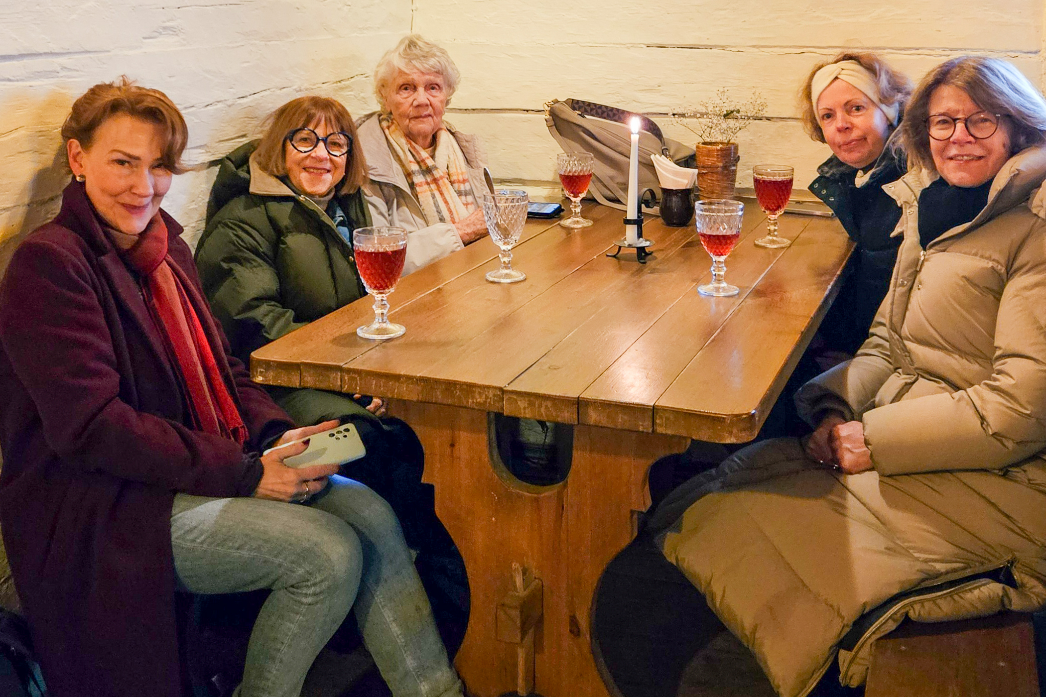 Kurze Auffrischungspause im Hotel und - wieder vorbei an einigen Highlights der Altstadt - ins Restaurant Rozengrals. Am Eingang sitzt eine finster blickende Gestalt in einem riesigen Gewand. Das sieht nach Räuberhöhle aus. Eva vertrauend, steigen wir vorsichtig die steile, schwer zu gehende Wendeltreppe hinab in die Höhle. Diese entpuppt sich als wunderschönes weitläufiges Kellergewölbe, stimmungsvoll düster durch Kerzen beleuchtet. Mittelalterlich gekleidete, freundliche Mädchen und Jungs empfangen und geleiten uns zu langen blanken Holztischen, die eingedeckt sind mit Salaten und Brot als Starter, gefolgt von einer Fleisch-Trilogie mit Gemüse und Nachtisch. Lecker? Erstmal mit der Taschenlampe nachschauen, was da serviert wird. Sieht vertrauenswürdig aus, also kann´s losgehen. So wurde mit Bier- und Weinbegleitung fleißig geschmaust und mit steigendem Geräuschpegel parliert, bis es Zeit fürs Bett wurde, in dem man vom schönen Tag träumend bald entschlummerte.