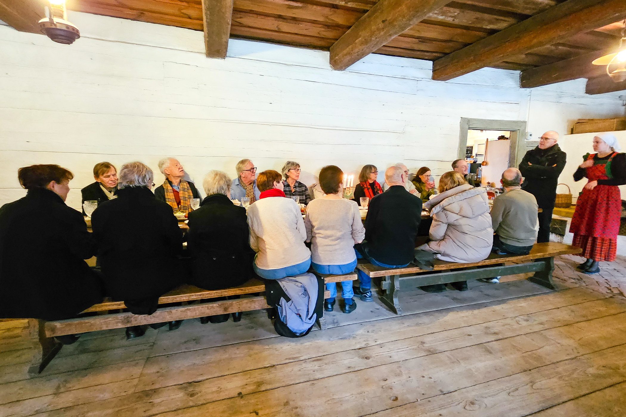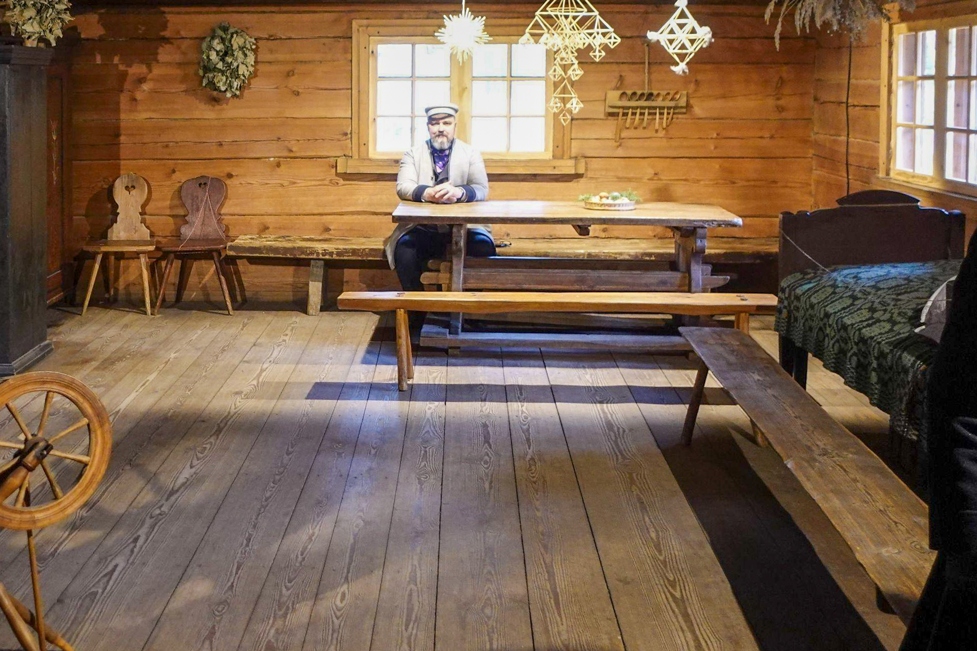 Ein Graubärtiger in feiner Tracht sitzt stolz lächelnd in seiner guten Stube am großen Esstisch und begrüßt stumm die Besucher. Ein verwunschenes, moosbedecktes Häuschen am zugefrorenen Teich unterhalb einer Windmühle. Am kleinen Hügel gegenüber eine Holzkirche mit wunderschöner Deckenbemalung. Engelscharen fliegen fröhlich über uns. Altar, Predigtkanzel, prachtvoll geschnitzt.