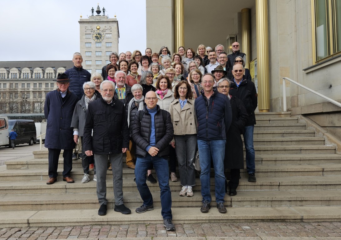 Durch den morgendlich quirligen Düsseldorfer HBF zum vereinbarten Treffpunkt. Eva und Oliver warten dort schon fröhlich und wohlorganisiert. Die Teilnehmer der Reisegruppe trudeln nach und nach ein. Jeder bekommt sein „Tütchen“ mit Reiseunterlagen und einem Bachkeks zum Anbeißen überreicht und ab geht´s zum Zug. Wohlgeordnet wird eingestiegen und jeder findet sein reserviertes Plätzchen. Fröhliches Geplapper, müde geschlossene Äuglein, zweites Frühstück oder auch nicht. So geht’s kurzweilig bis Frankfurt. Verwirrende Ansage, fährt er jetzt zum HBF oder doch nicht. Er fährt. Rasch rüber zu Gleis 9. Ansage: nein heute Gleis 8 gegenüber. Da kommt der Zug schon, aber wo ist unser Wagen? Einige steigen ein, doch halt, schnell wieder raus, das ist der Zug nach Hamburg. Dann ist er endlich da, der Richtige und wird gestürmt, da ein Zug ausgefallen ist. Es schiebt sich durch die Gänge vor und zurück, aber irgendwann hat jeder seinen Platz und es geht nach Leipzig HBF.