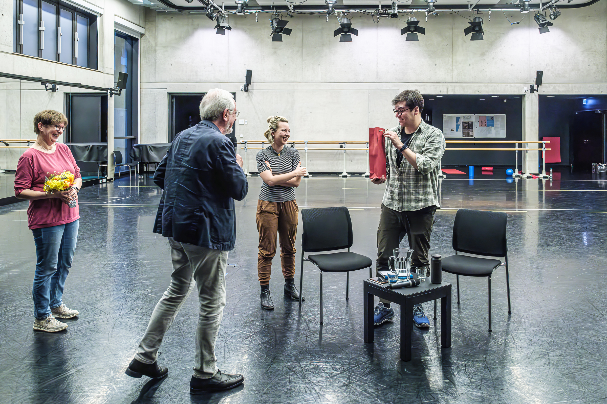 Zum Abschluss des Gesprächs fragt Julia Schinke, welchen Wunsch Demis Volpi für seine letzte Produktion in Düsseldorf habe. Hier formuliert Demis Volpi die Hoffnung, zu seinem Abschluss in Düsseldorf etwas auf die Bühne zu bringen mit einer Qualität, die anregt zum Austausch. Das gemeinsame Erleben im Theater, dem einzigen Ort heutzutage, wo man sich hinbegebe, um zunächst zuzuhören, wo man still sitzen müsse, sei so selten und wichtig geworden. Gemeinsam zu schweigen, um sich anschließend auszutauschen über eine Welt, die sich gerade erschlossen hat und zu Diskussionen anregt… das sei ihm wichtig.