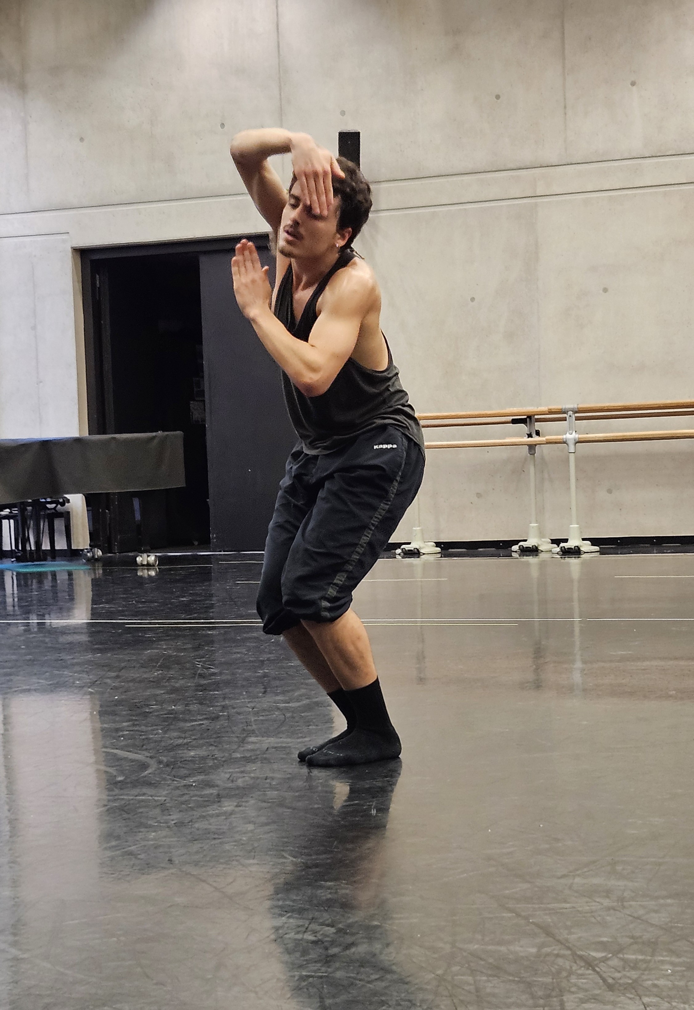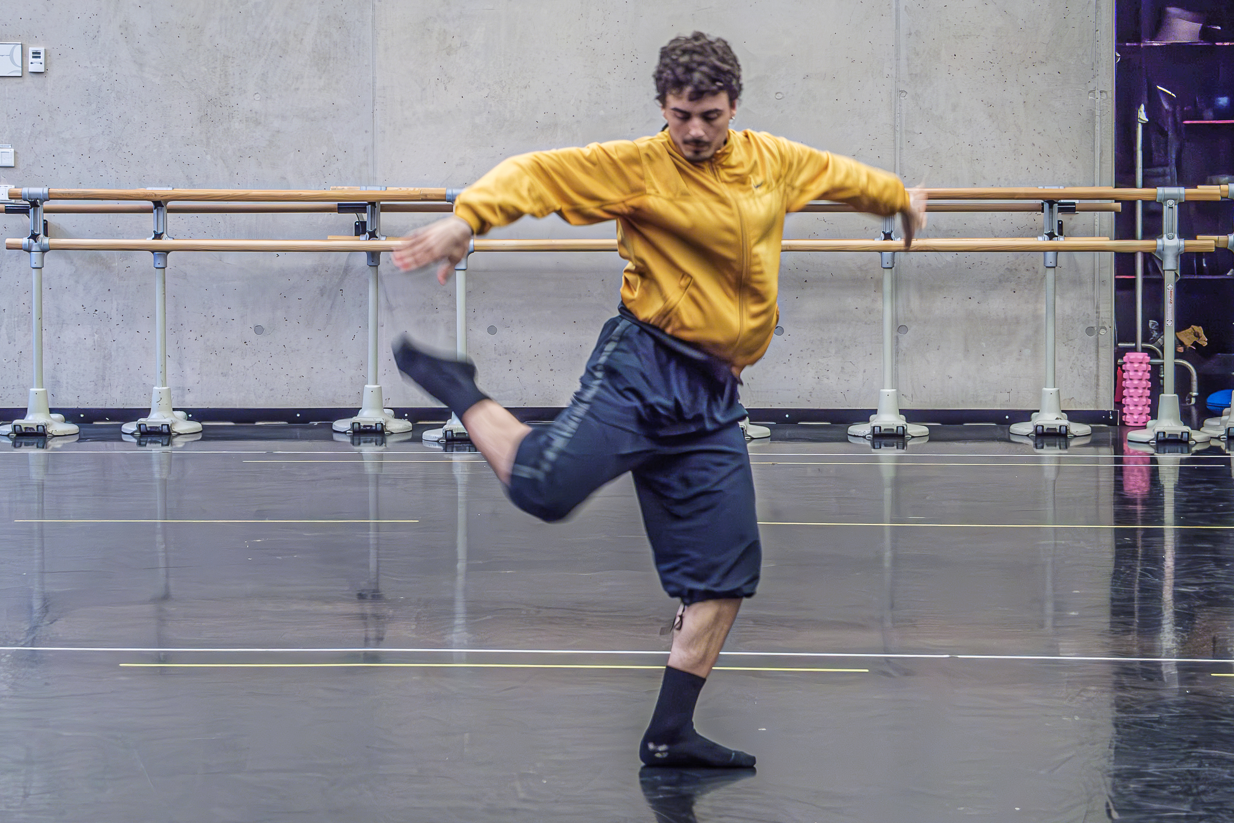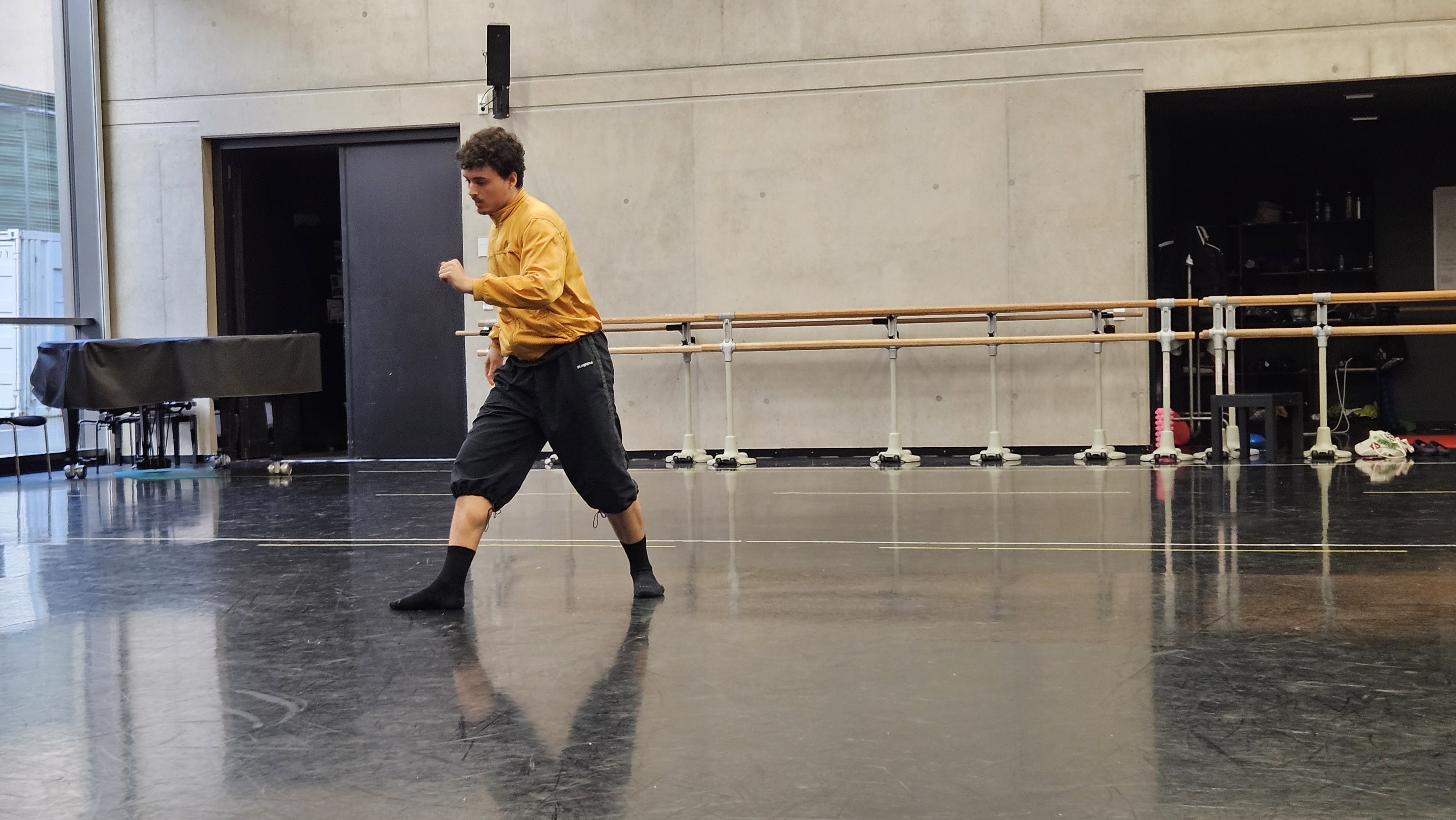 Zu dieser letzten Arbeitsprobe des scheidenden Ballettchefs waren viele interessierte Ballettfreunde in Studio 1 erschienen. Auf der Probenfläche hingegen war es weniger voll, probte doch Demis Volpi „nur“ ein Solo mit Miquel Martinez Pedro, wie er in der Begrüßung fast entschuldigend ankündigte. Auch gäbe es eine „stille“ Arbeitsprobe zu beobachten, führte er weiter aus, ohne nennenswerte Musikeinspielungen. Nur einmal an diesem Abend warde nn auch ein kleiner Ausschnitt des furiosen Klang- Zyklus von „Surrogate Cities“ zu hören, gegen Ende der Arbeitsprobe, als das einstudierte Solo in einem Durchlauf getanzt wurde.