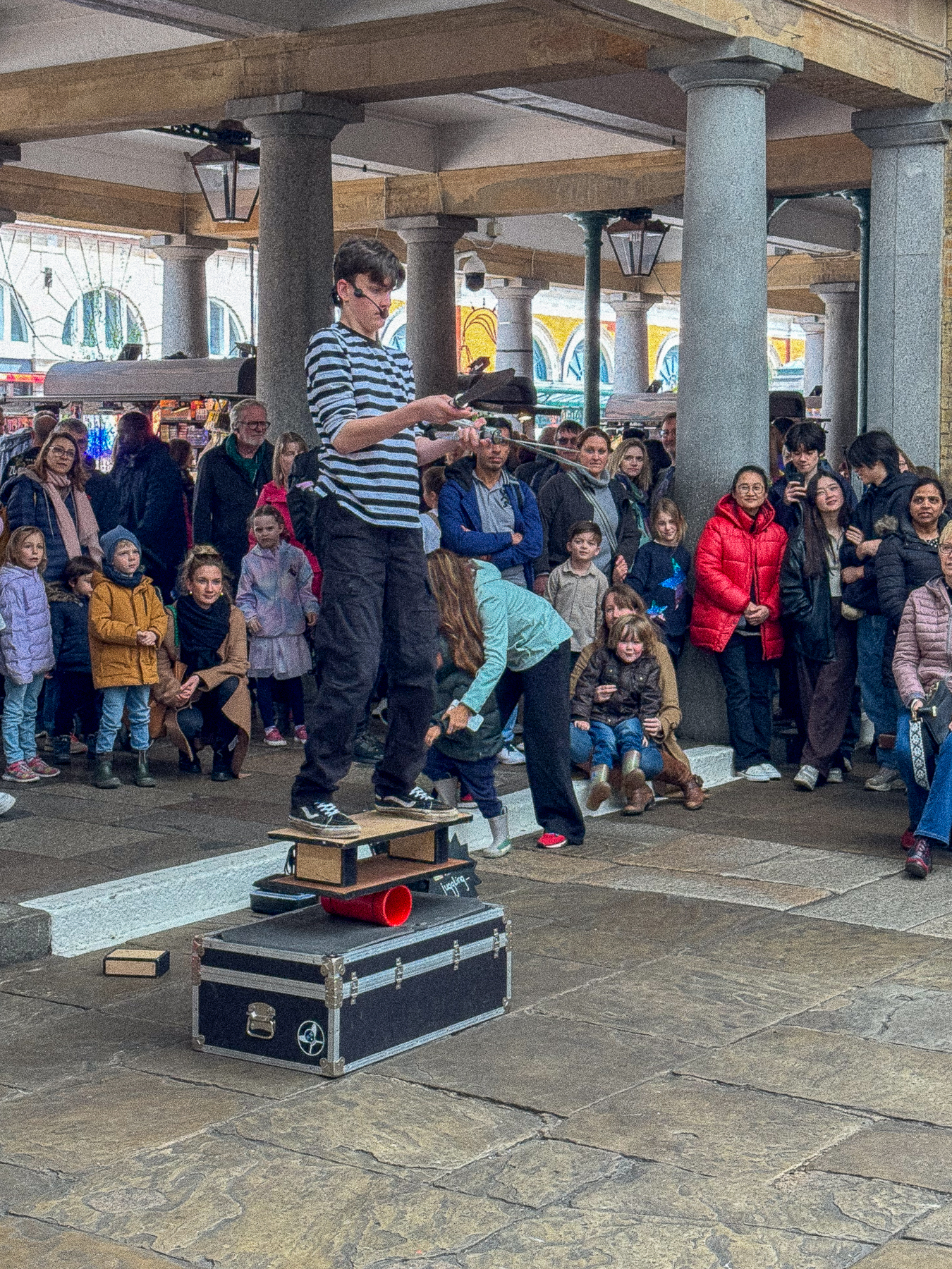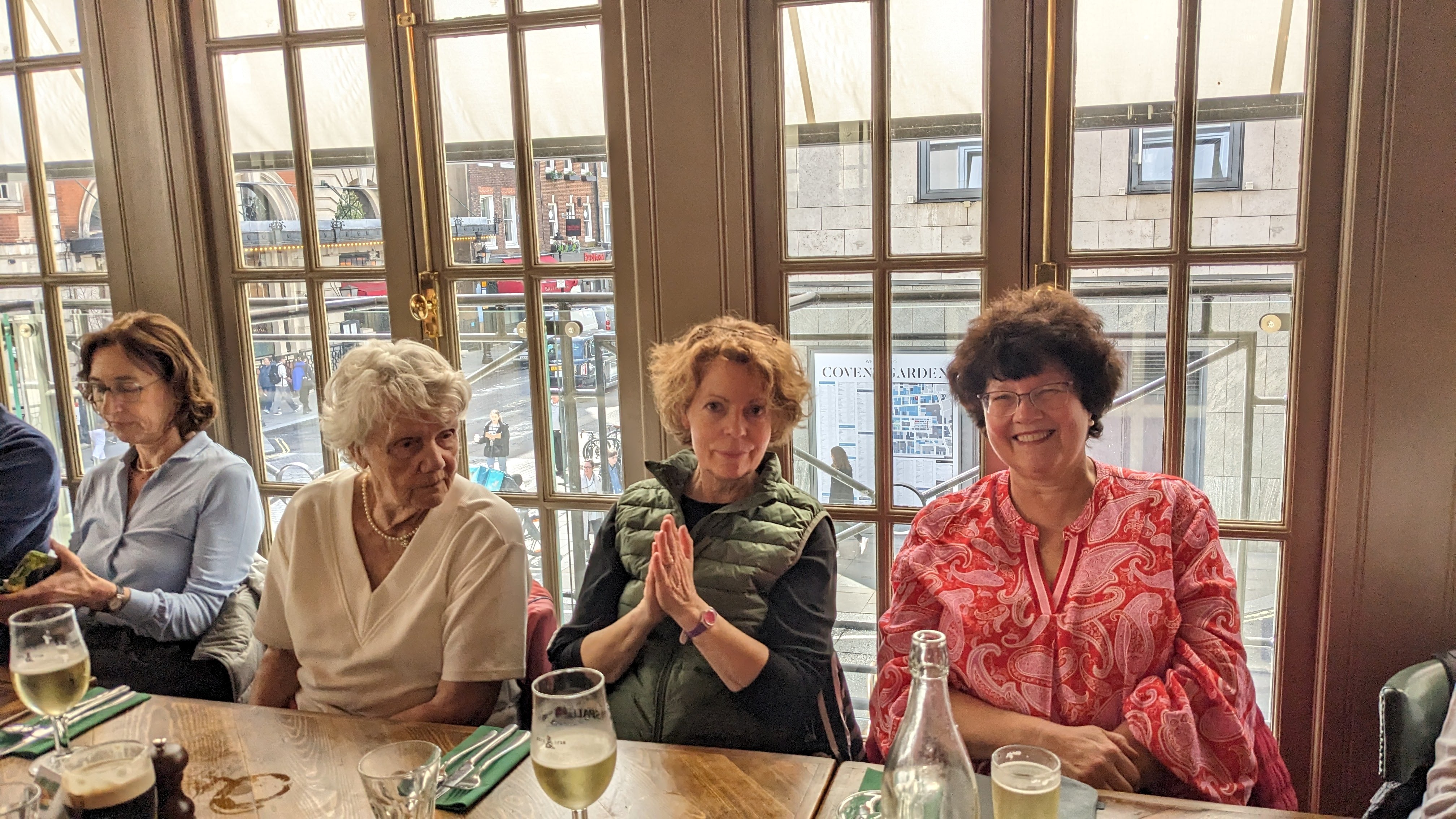 Noch ein windzerzaustes Gruppenfoto bei den gigantischen silbernen Ballettschuhen vor dem Balletthaus und zurück gings ins quirlige London Center zum Lunch im Pub „Marquess of Anglesey“. Vorher kurzer Spaziergang durch die Hallen des ehemaligen Gemüsemarkts am Covent Garden, heute Präsentationsort, für alles, was der Mensch eher weniger benötigt und natürlich genügend Gelegenheit, um für das leibliche Wohl zu sorgen. Musik gab‘s auch. Ein Tenor versuchte pavarottimäßig gegen den Hintergrundlärm anzusingen. Sein Kumpel ging derweil mit seiner Mütze als Klingelbeutel herum. Zum Abschluss ein Foto bei der Skulptur der Tänzerin, die sich in graziöser Haltung geduldig ablichten ließ. Zur Belohnung dann englische Köstlichkeiten im urigen Pub.