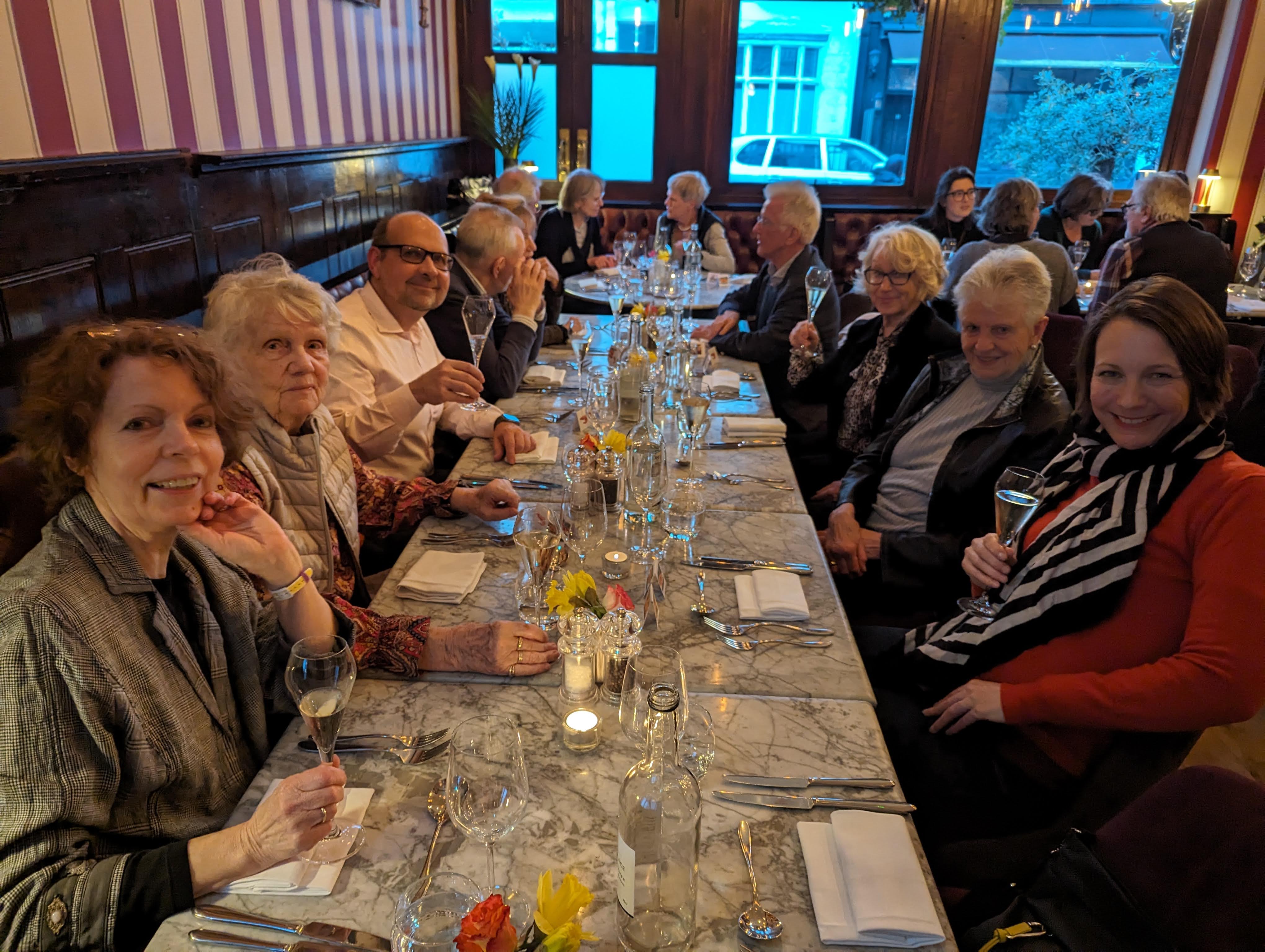 Plaudernd füllten wir das Lokal bis zum letzten Platz. Also geschlossene Gesellschaft. Guter englischer Sekt förderte die Unterhaltung und bald brummte es wie in einem Bienenkorb, nur unterbrochen durch die köstliche Speisenfolge. Beschwingt ging‘s zurück, um schnell einschlafend den Morgen zu erwarten.