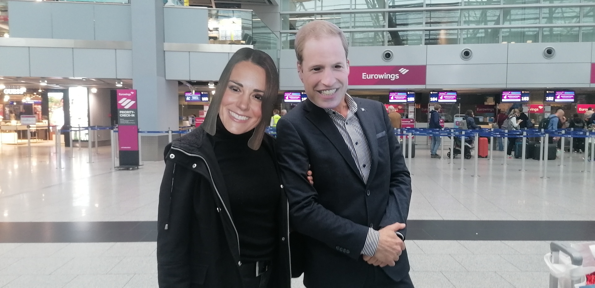 Flughafen Düsseldorf. Welch königliche Überraschung: Die schöne Kate und ihr eleganter Gemahl, königliches Geblüt vom Scheitel bis zur Sohle, begrüßten uns huldvoll lächelnd. Und wer kam hinter dieser Maskerade hervor? Natürlich Eva und Oliver mit einem nicht minder fröhlichen Begrüßungslächeln.
