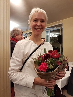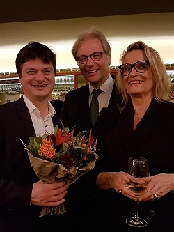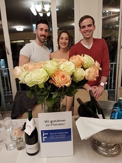 Unser Foto zeigt die Compagnie-Mitglieder Filipe Frederico, Sonia Dvořák und Michael Foster, die sich nach der Premiere von b.37 als Erste um den Rosenstrauß kümmerten. Den nächsten Strauß darf die Compagnie für den 9. Februar 2019 zur Premiere von b.38 erwarten.