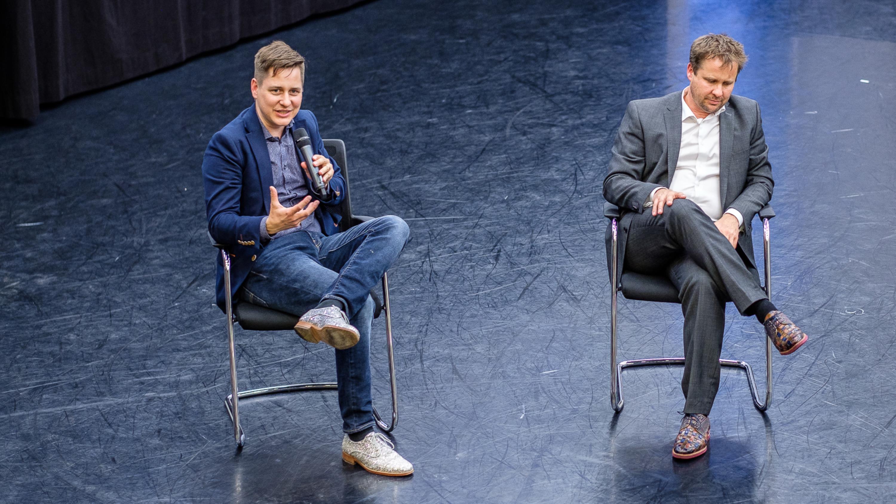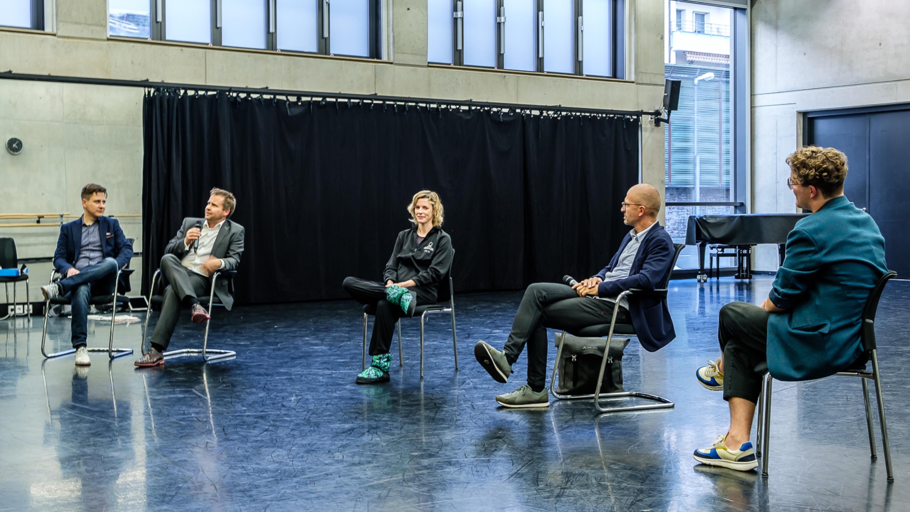 Der Dramaturg Maurice Lenhard führte durch den Abend, an dem die Choreographin Virginia Segarra Vidal – uns bekannt als Mitglied der Compagnie, der Dramaturg der Tonhalle Uwe Sommer-Sorgente und Nick und Clemens Prokop teilnahmen. Die Gebrüder Prokop sind als „Trust Your Eyes“-Team (TYE) für das Konzept und die mediale Inszenierung zuständig.