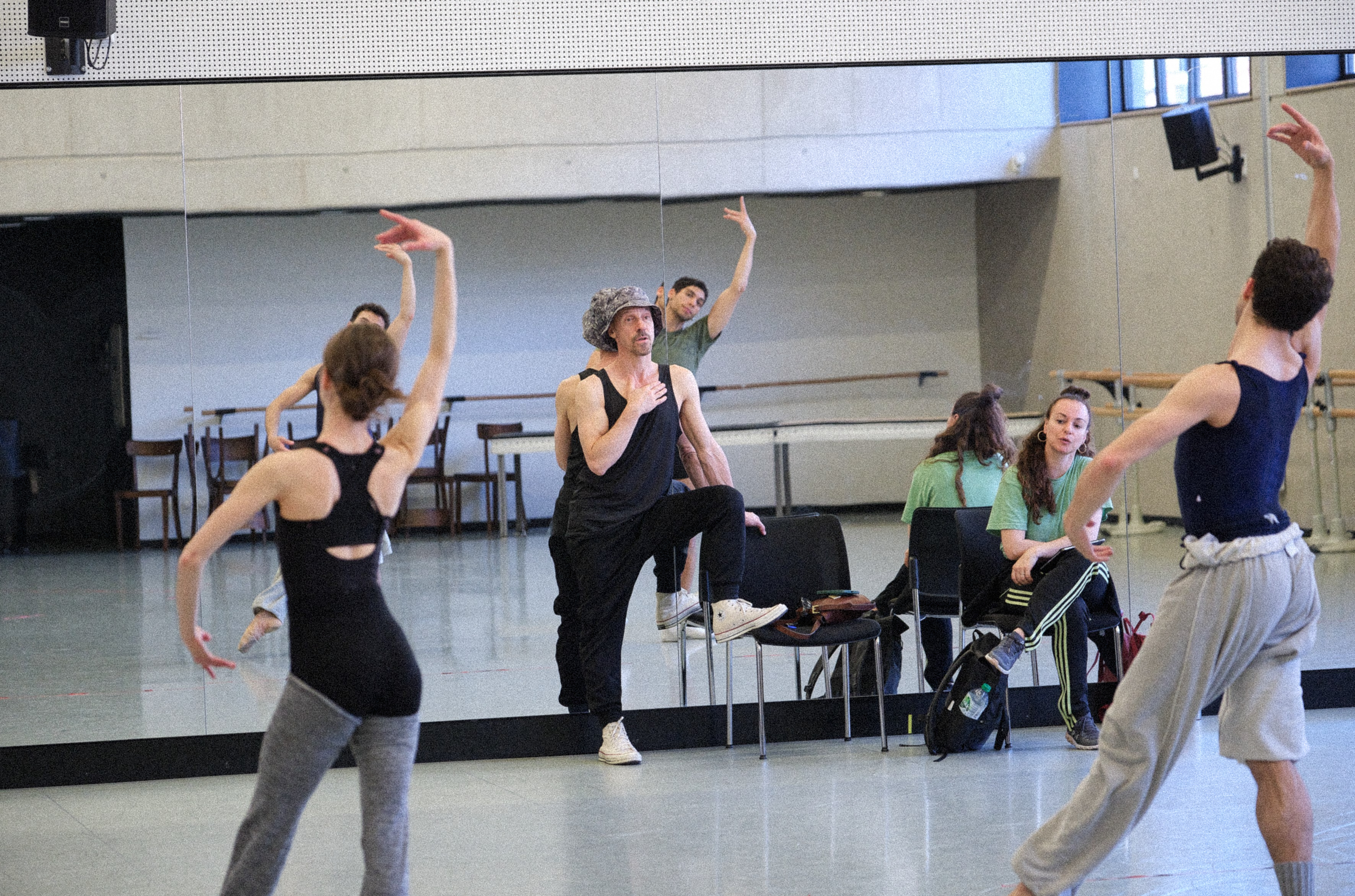 “Ich will ein Beispiel geben. Für Bolero gibt es ein Laufband wie am Flughafen, ein richtig großes Laufband, auf dem die Tänzer tanzen. Aber es ist nicht nur sehr groß, sondern auch sehr laut. So laut, dass das Orchester am Anfang von Bolero, der ja sehr verhalten beginnt, sich nicht hören kann, und man im Zuschauerraum auch nichts vom Orchester hört. Dieses Problem hatten wir bei den Proben im Balletthaus natürlich nicht. Also was tun? Raphaël meinte « Art making is problem solving » und hatte eine sehr gute Idee! Irgendwann ist die Musik im Bolero laut genug, dass man das Laufband nicht mehr hört. Und vorher wird ein Komponist elektronisch die Atmosphäre von Bolero aufnehmen und ein elektronisches Stück am Anfang einspielen. Das Orchester setzt dann ein, wenn es so laut ist, dass man die Maschinengeräusche nicht mehr hört. Das nennt man Problem solving!“