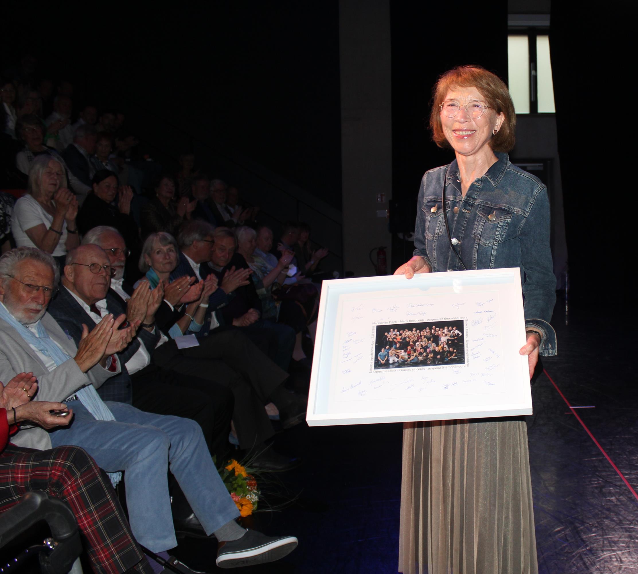 Hanne Sauer, über viele Jahre im Vorstand der Ballettfreunde engagiert, erhielt zum Dank für ihre Tätigkeit ein mit allen Unterschriften versehenes Foto der Compagnie.