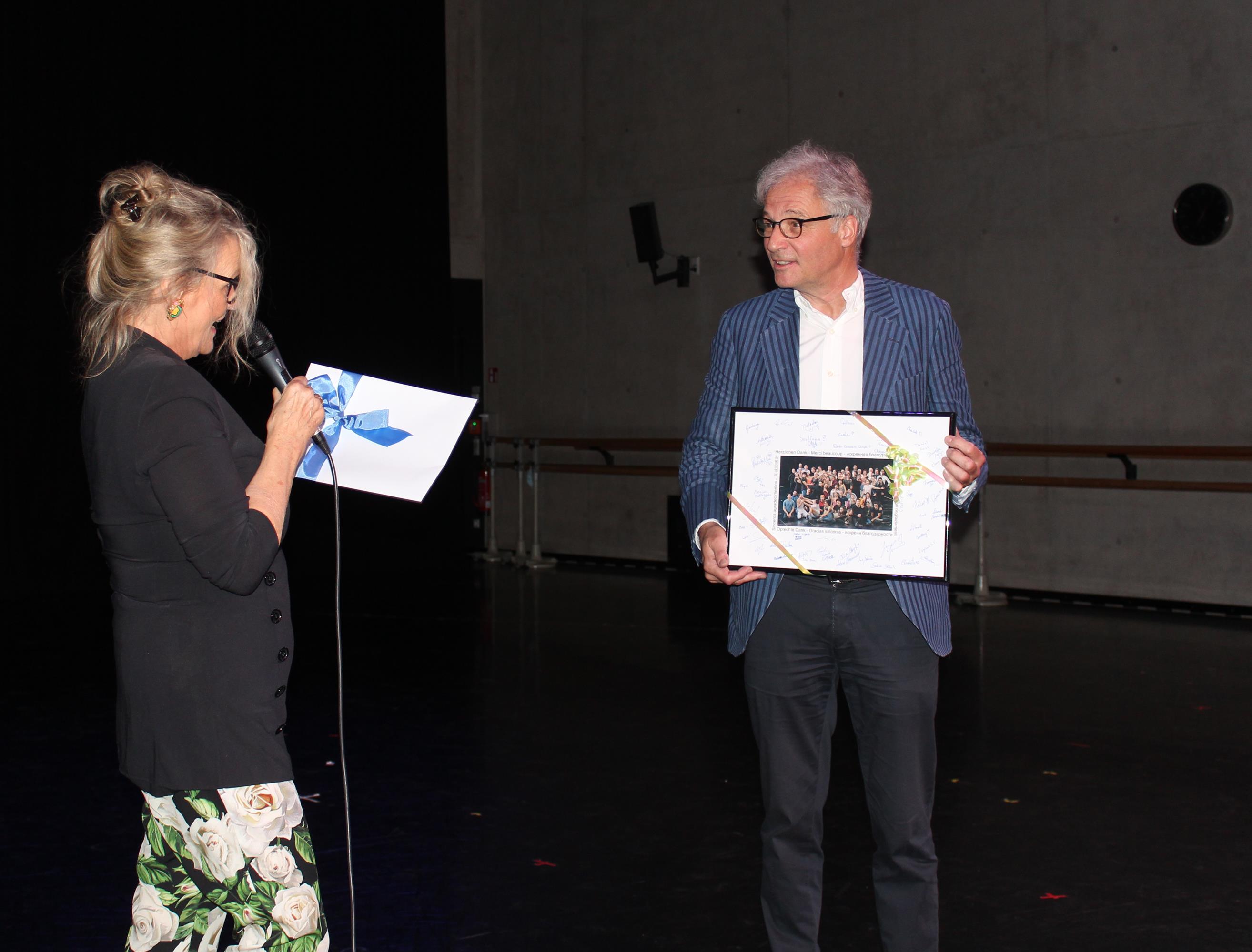 Nach der Begrüßung durch Egon Schawe und Ballettdirektor Demis Volpi übernahm Renate Raeune das Mikrofon und führte fröhlich – auch mehrsprachig - durch den Abend.
