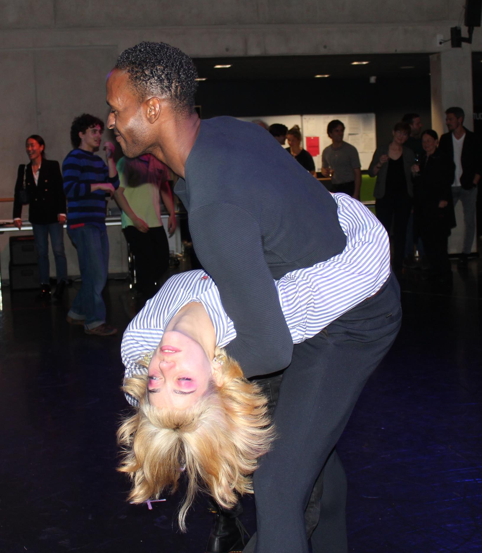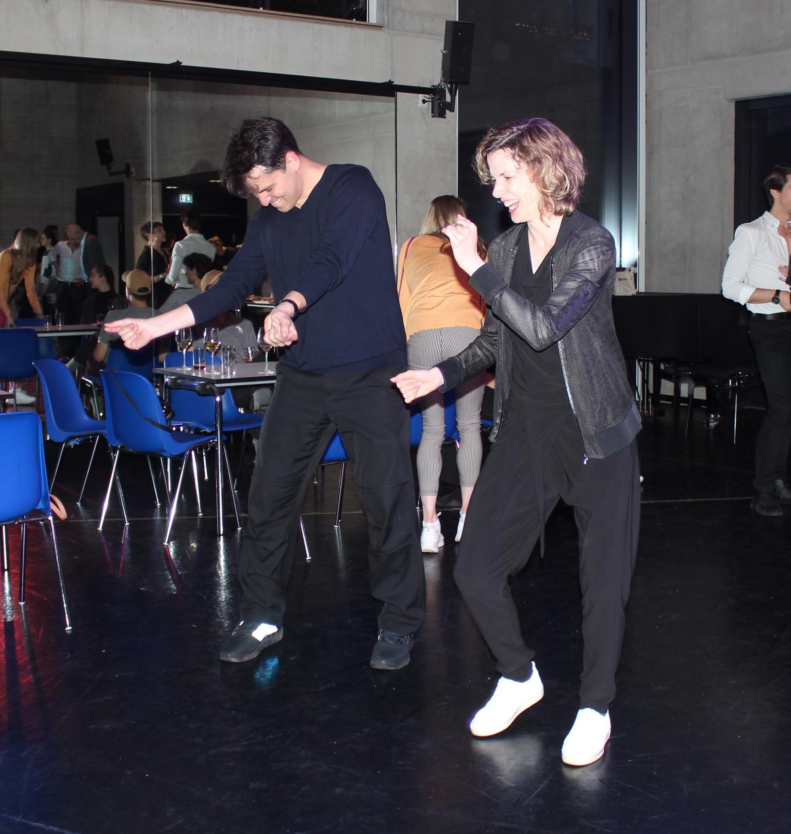Irgendwann erklang Musik und es liegt im Blut und in den Beinen der Tänzerinnen und Tänzer, dass sie diese sofort in ausgelassene Bewegungen umsetzen. Davon ließen sich auch Ballettfreunde anstecken und bald wirbelten sie alle zusammen ausgelassen über das Parkett, mit Demis Volpi in der Mitte.