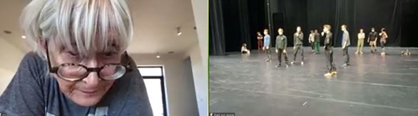 Nach einer Einführung in das Stück durch Carmen Kovacs führte Oliver Königsfeld die Ballettfreunde mit der Kamera in den Zuschauerraum des Opernhauses. Dort war ein Regiepult aufgebaut mit zwei Monitoren. Ein Monitor zeigte die Bühne, auf der die Tänzerinnen und Tänzer mit dem leitenden Ballettmeister Damiano Pettenella arbeiteten, der zweite Bildschirm zeigte Twyla Tharp, die aus ihrer New Yorker Wohnung Anweisungen für die Choreographie gab. Im Stream waren die beiden Bilder nebeneinander zu sehen, so dass die Ballettfreunde gut die jeweiligen Reaktionen der Compagnie und Twyla Tharps aufeinander verfolgen konnten.