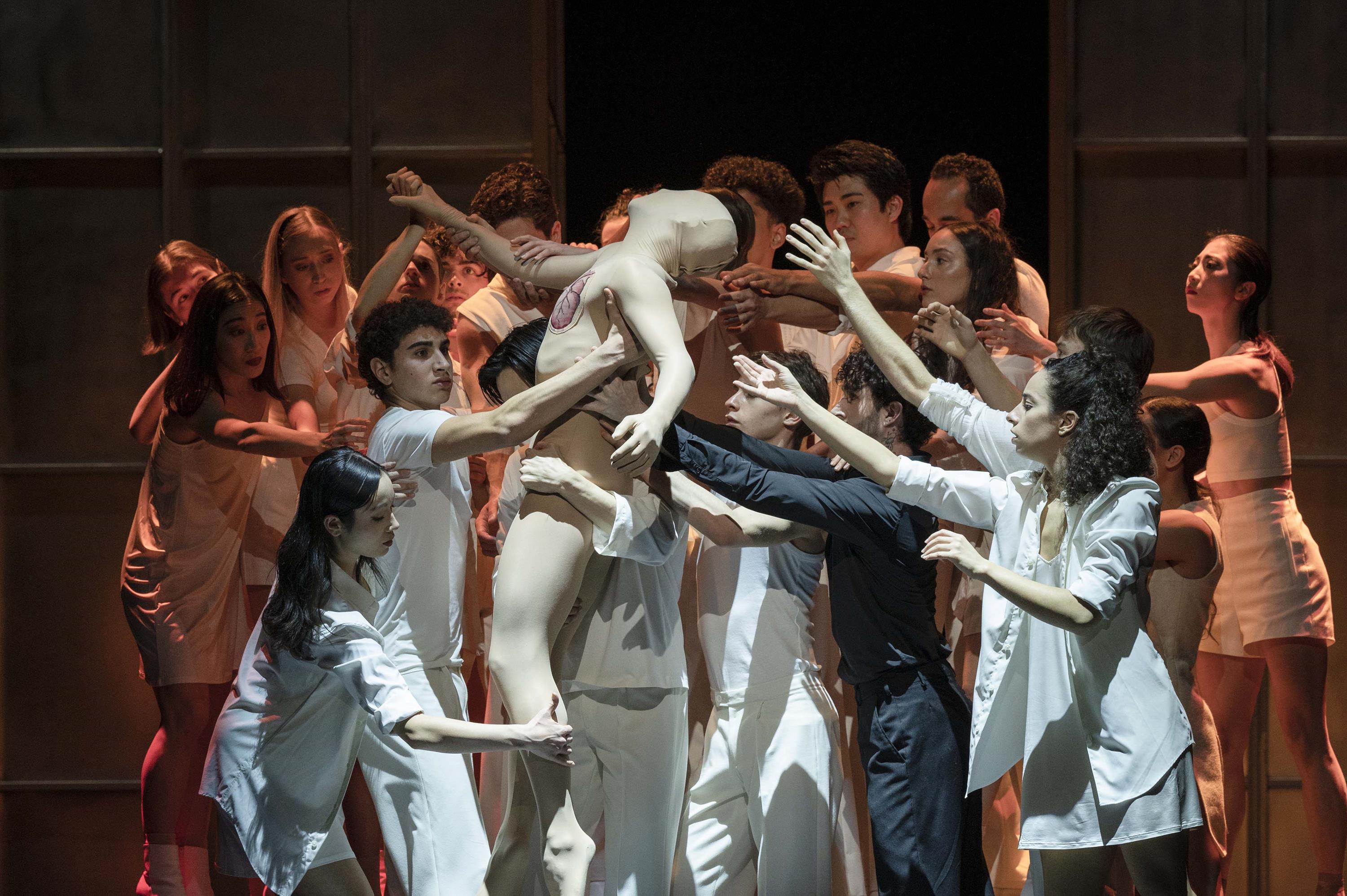 In Hélène Blackburns „Coppélia X Machina“ fällt im 1. Akt ein puppenähnliches Wesen aus dem Bühnenhimmel und wird von den Tänzerinnen und Tänzern aufgefangen. Die Gestalt trägt ein fleischfarbenes Kostüm mit einem roten Herzen.